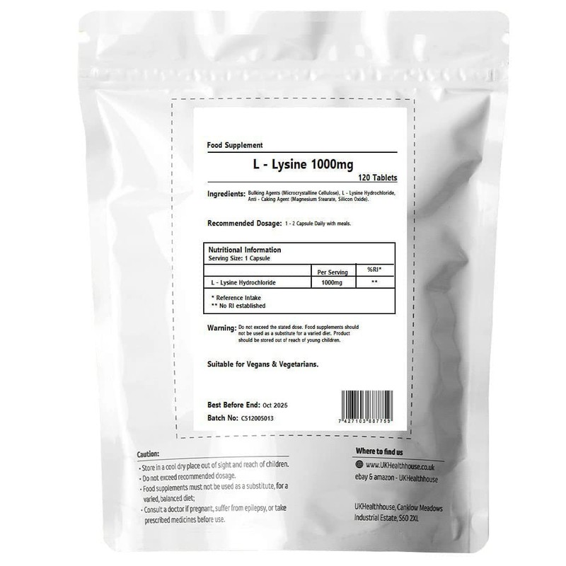 Ingredients: Bulking Agents (Microcrystalline Cellulose), L-Lysine Hydrochloride, Anti-Caking Agent (Magnesium Stearate, Silicon Oxide).