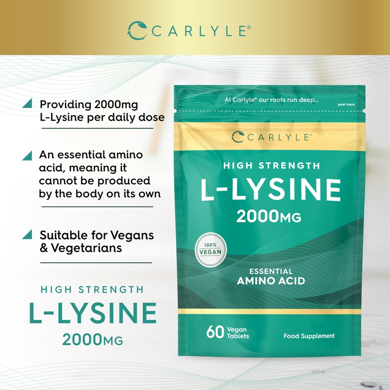 Today there are many different forms of Lysine supplements available such as; powders, liquids, capsules, gels, drops and gummies. But look no further than Carlyle for high potency and easy-to-swallow tablets. Simply take two 1000mg tablets daily and reap the benefits of this essential amino acid.