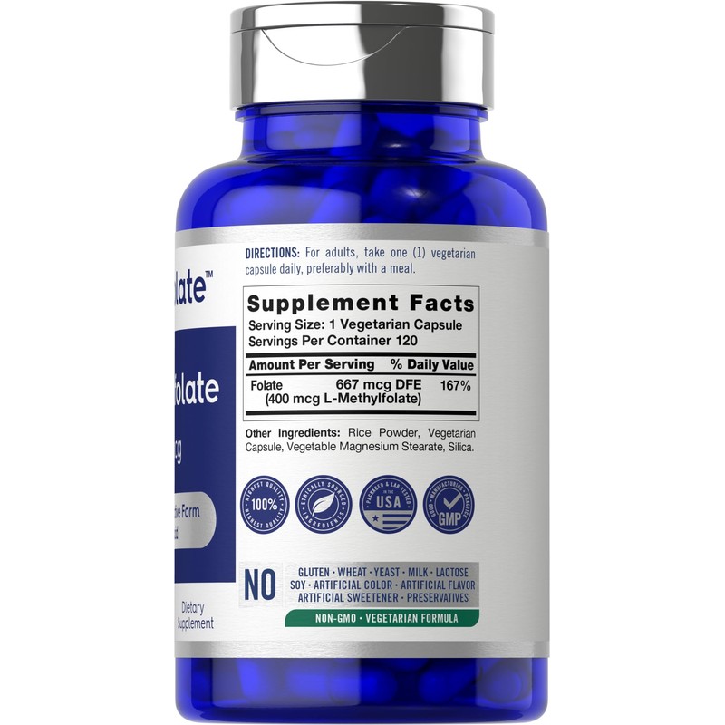 Our advanced formula features 400 mcg L-Methylfolate, 167% of your recommended daily value, in vegetarian capsules. It's gluten free and non-GMO, plus it's made with no artificial flavor, sweetener, or preservatives, making it a top supplement of choice for men and women everywhere!