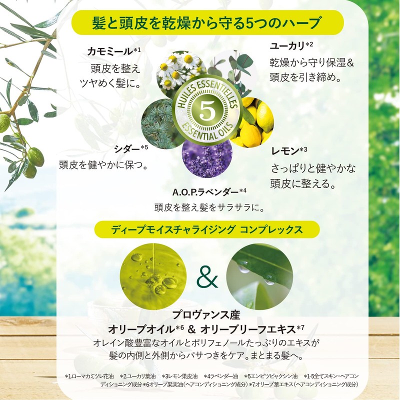 - Southern French Olive Oil (*1) extracted from olive fruit and Olive Oil Extract (*2) from leaves to moisturize hair (refill). Not only does it leave you uncomfortable and spreading out, but it also moisturizes the scalp, and leads to an elegant and clean hair. (*1) Olive Fruit Oil (Hair Conditioning Ingredient) (*2) Olive Leaf Extract (Hair Conditioning Ingredient)