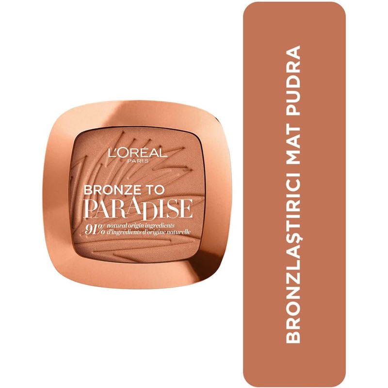 Missing that summer sun or want to top up your tan? Get your glow on, with L'Oreal bronze to paradise, matte bronzing powders. Soft matte bronzers, with no shimmer or Glimmer providing a summertime 'tanned' Look all-year - no sun needed! The bronzers are super-buildable, so you can customise your bronzed look with ease. Apply the bronzer over your cheeks, chin and forehead for a warm, glowing look, or use it in the hollows of your cheeks and under the jawline for a sculpted contour. A flush of bronze that's so natural and luminous. Missing that summer sun or want to top up your tan? Get your glow on, with L'Oreal bronze to paradise 02. Baby one more tan, a matte bronzing powder with 91% natural derived ingredients. A soft matte Bronzer, for a summertime 'tanned' Look all-year - no sun needed! The matte bronzing formula with no shimmer or Glimmer is perfect for your no-makeup luminous makeup look. The powder is super-buildable, so you can customise your bronzed look with ease. Apply the bronzer over your cheeks, chin and forehead for a warm, glowing look, or use it in the hollows of your cheeks and under the jawline for a sculpted contour. A flush of bronze that's so natural and luminous.