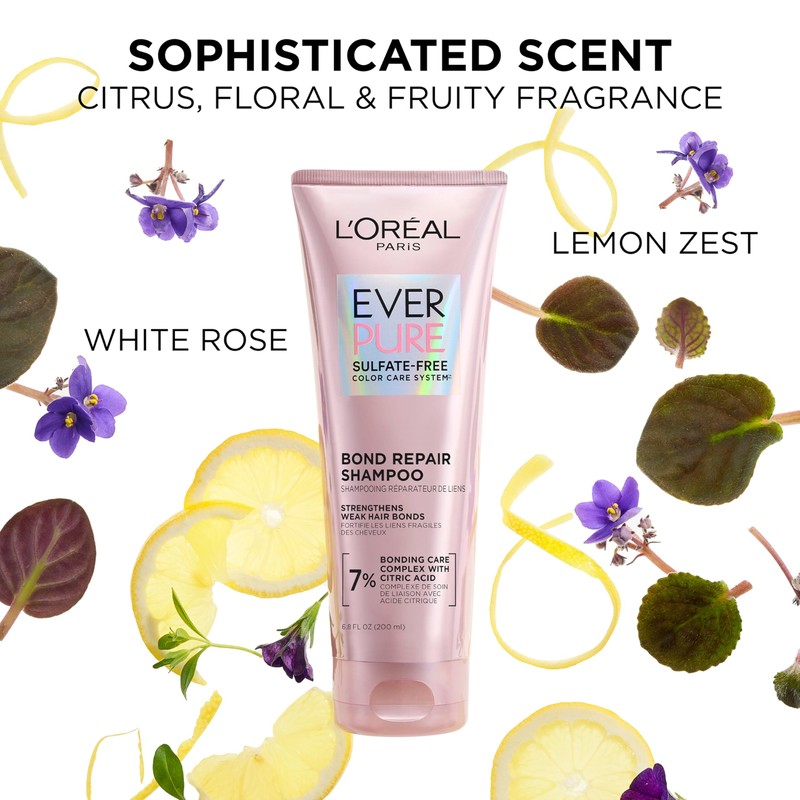 L'Oreal Paris EverPure Bond Repair hair care system, with citric acid, repairs and strengthens color treated, damaged, and fragile hair while leaving hair soft. Prior to shampoo, prep with Bond Repair Pre-Shampoo repairing treatment to penetrate inside the hair to rebuild weak bonds. Follow with the Bond Repair Shampoo and Conditioner. Try our EverPure Bond Repair Oil-in-Serum for a shiny finish. Scientifically proven to strengthen hair and reduce breakage. 100% Sulfate Free Shampoo and Conditioner, Paraben Free, No Harsh Salts, No Harsh Surfactants, Dye Free, Gluten Free*, Vegan Formula**. Validated by Colorists. Safe to use as daily hair care regimen. Our formulas are especially gentle on color treated hair.