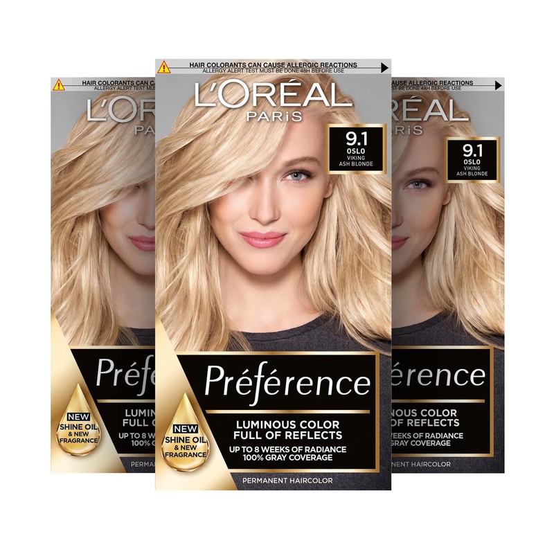 - Box contents: 3x L'Oréal Paris Préférence permanent hair colour, colour: 9.1 Oslo (very light ash blonde), contents: hair dye set with colour gel, developer cream, oil drops, conditioner, 1 pair of disposable gloves