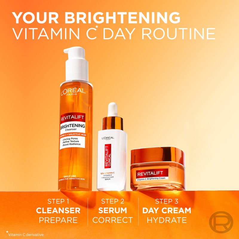 - Create your Revitalift Brightening Vitamic C Routine. Step 1: Prep and cleanse skin with the L'Oréal Paris Revitalift Clinical Vitamin C + Salicylic Acid Foaming Cleanser 150ml. Step 2: Correct with L’Oréal Paris Revitalift Clinical 12% Pure Vitamin C Serum. Step 3: Hydrate with the L'Oréal Paris Revitalift Bright & Pore-smooth vitamin C Cream.