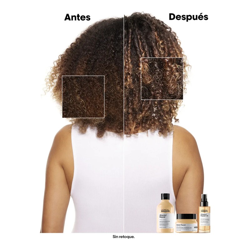 Su fórmula avanzada está enriquecida con quinua dorada y proteínas, ingredientes clave que actúan para reparar y fortalecer el cabello al instante. Al usar esta mascarilla como parte de la rutina completa Absolut Repair, notarás un cabello hasta 7 veces más brillante.