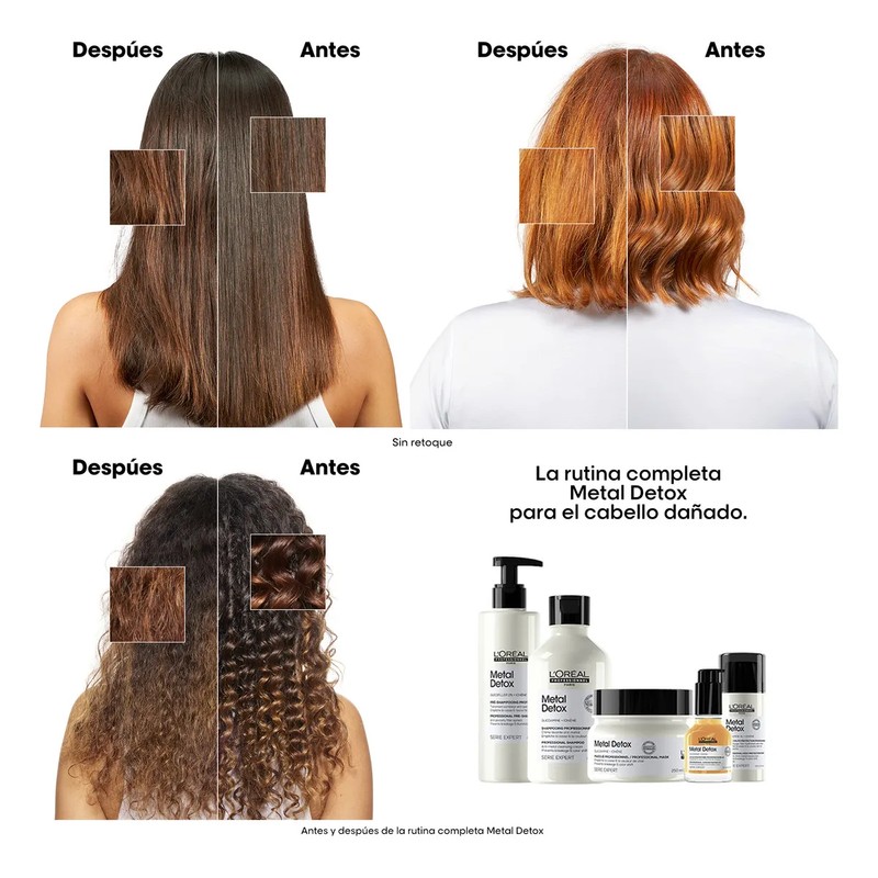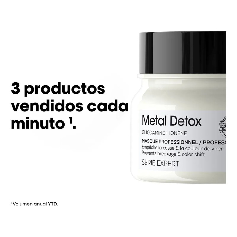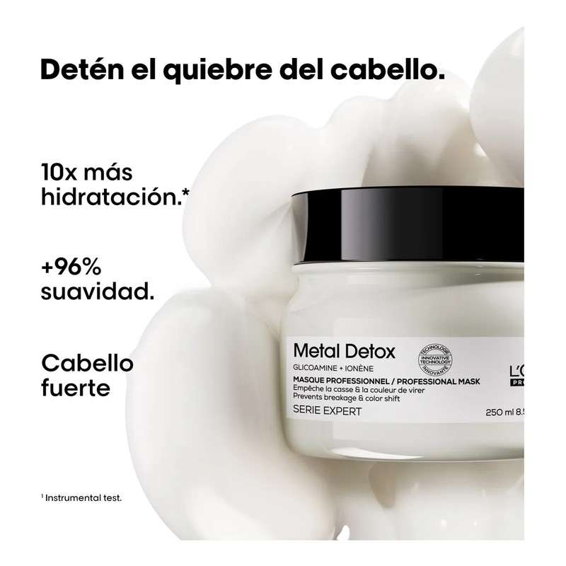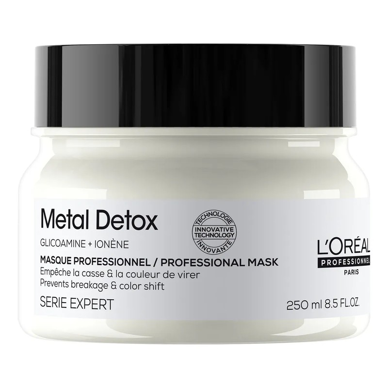 ✨ La Mascarilla L'Oréal Professionnel Metal Detox (250ml) es un tratamiento que desintoxica y protege el cabello de la acumulación de metales en el agua, previniendo el quiebre y asegurando la fidelidad del color (hasta 93% de conservación). Con Glicoamina, deja el cabello suave, nutrido y con brillo intenso. Es sin sulfatos ni parabenos, hipoalergénica y vegana.