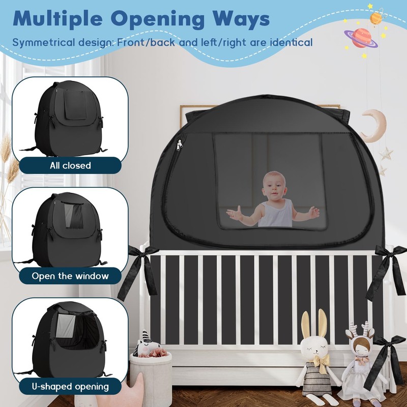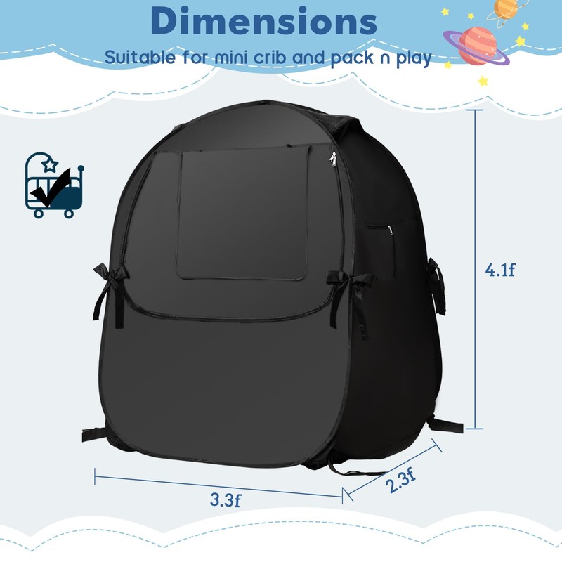 - Ensure ventilation: Our blackout tent for pack and play includes two pockets to storage, two windows with pillars for ventilation. And both sides of the blackout pack n play cover has openable panels that can be used either as vents or as windows to regulate light levels to meet your child's needs