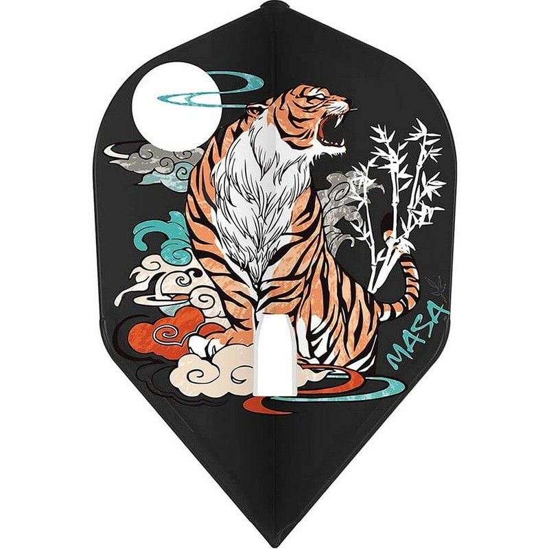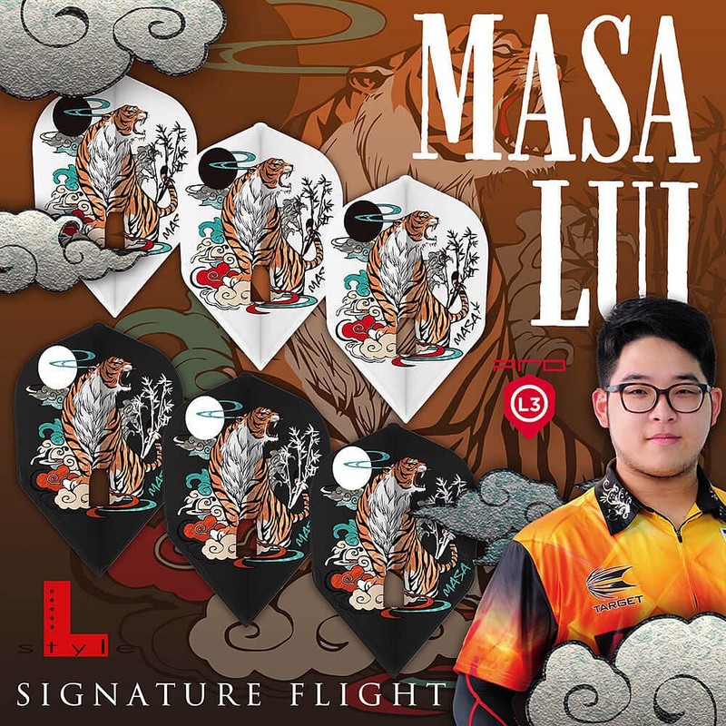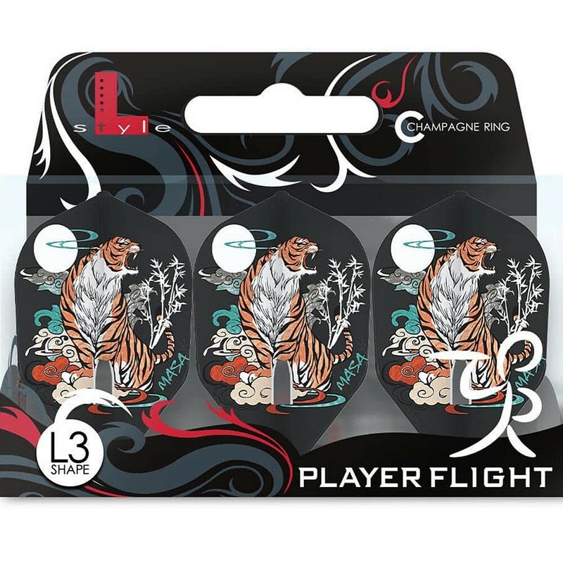 L-Style Champagne Flights Pro by Masa Lui.The Champagne Flights Pro from Masa Lui have a black or white base colour with a detailed tiger standing in the jungle. The design of the Masa Lui dart flights is applied on both sides and looks very stylish and plastic. The Masa Lui Champagne flights are available in the popular L3 shape shape.
