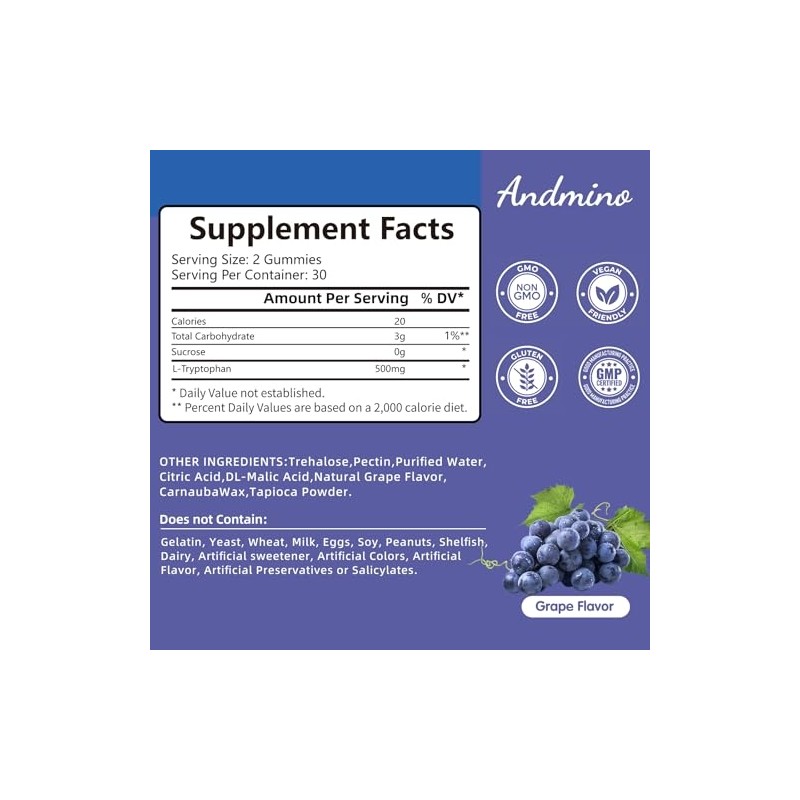 L-Tryptophan Gummies 500 mg, with Trehalose, for Natural Relaxation & Serotonin Support, for Adults & Kids, Non-GMO, Vegan, Gluten Free, Grape Flavor, 60
