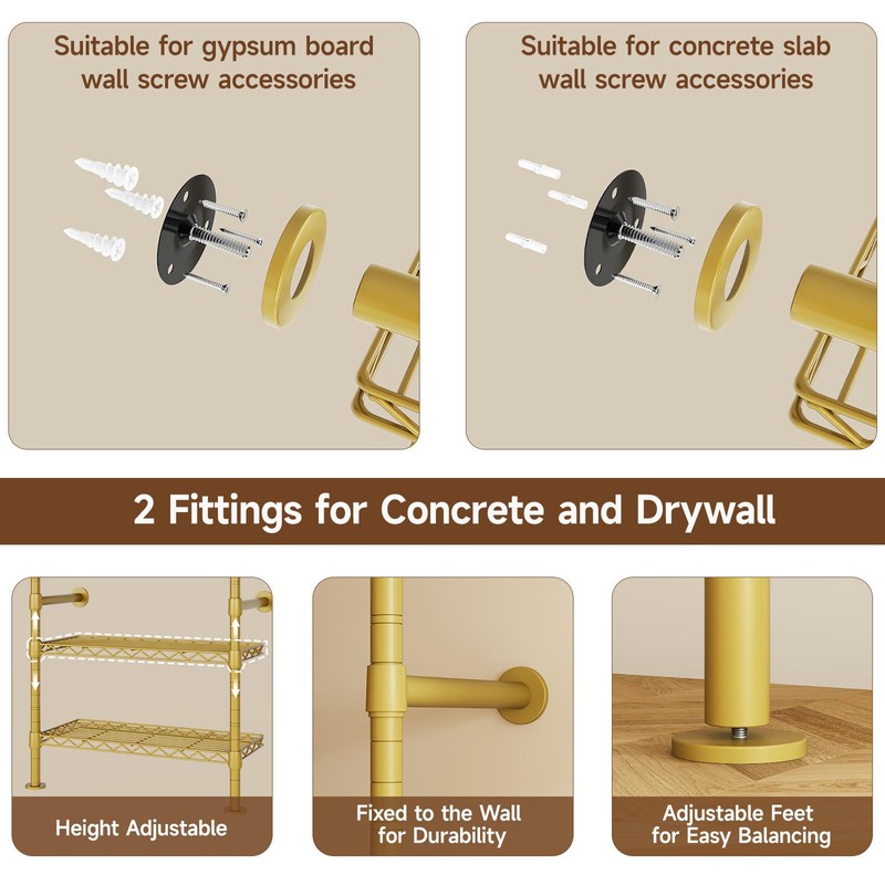 【Sturdy & Collapse-Resistant Construction】Built with premium matte powder coated metal pipes, this wall mounted closet system is sturdy and stable, not easy to deform to ensure durability, and is equipped with a secure wall mounted system that won't shake or collapse to avoid accidental tipping.