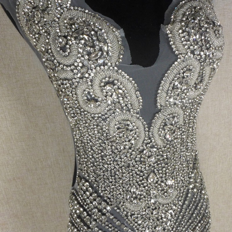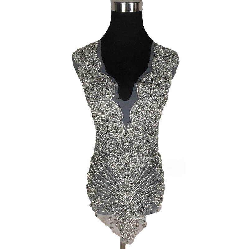 This luxury rhinestones appliues is full piece, the best don't cut it.The applique patch can be sew onto mesh(or other fabrics).Then cut the spared mesh off ,sew the applique on the dress. These patchs can be dry cleaned. This glass crystals beaded appliuqe patch can be dry cleared.