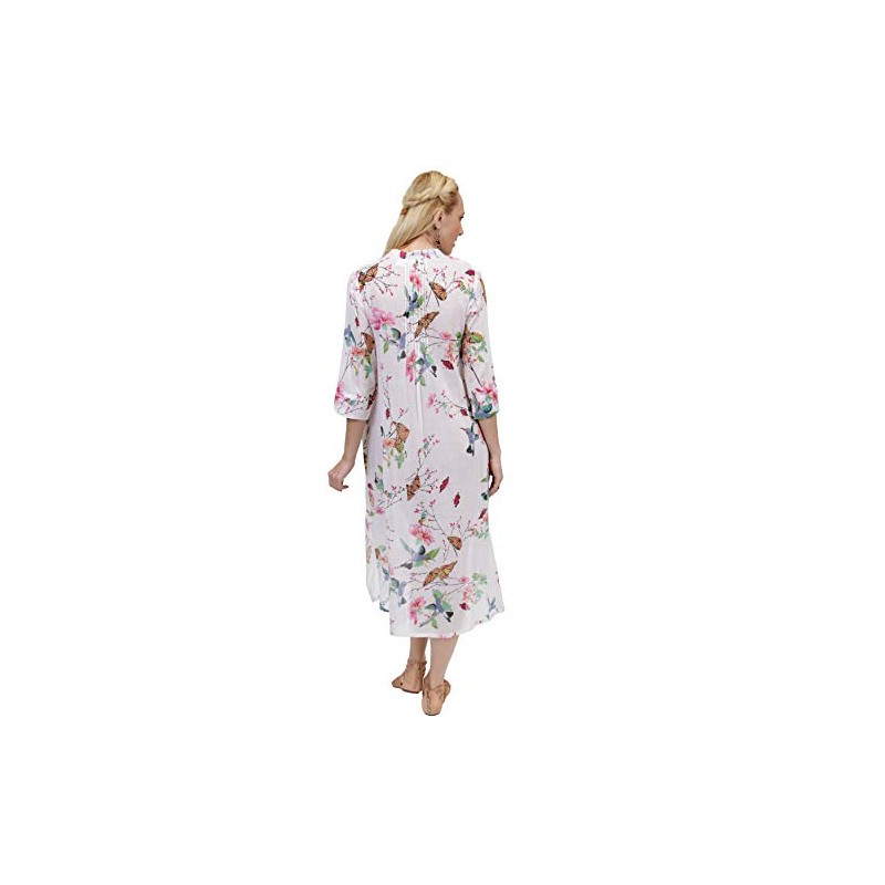 LA CERA Women’s Cotton Caftan Dress, Floral Hummingbird Print, Rounded V-Neck, 3/4 Sleeves, White Dress, Machine Washable