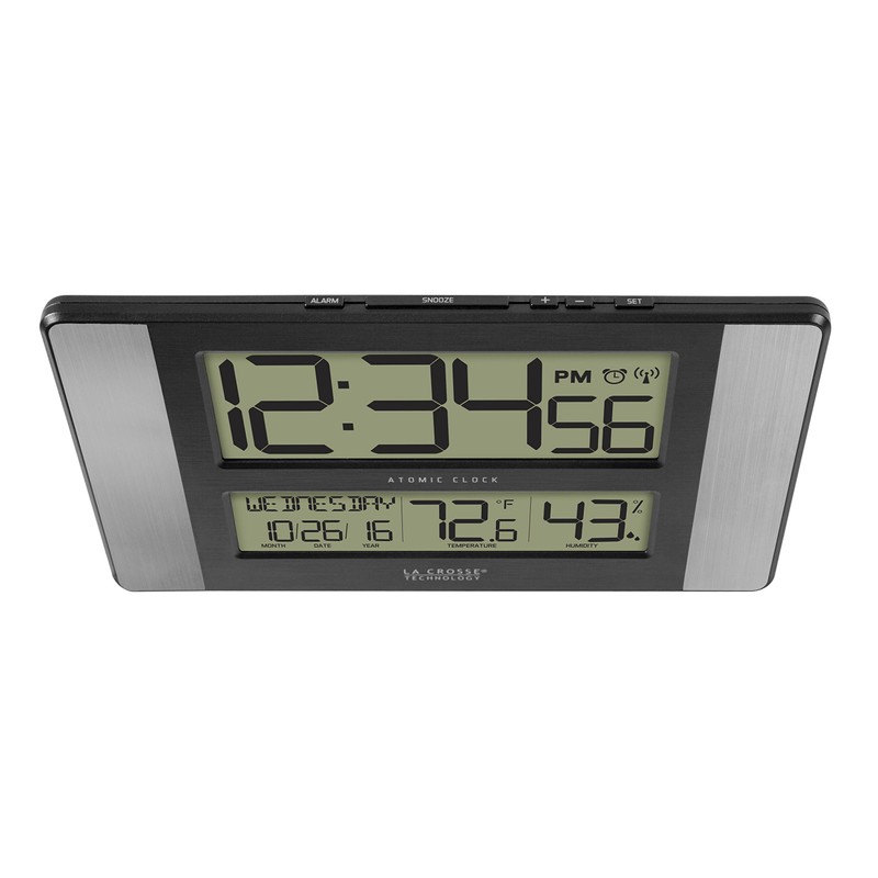 La Crosse Technology 513-1417H-AL-INT Atomic Clock with Temperature & Humidity, 11.10" L x 1.14" W x 6.61" H, Grey/Black