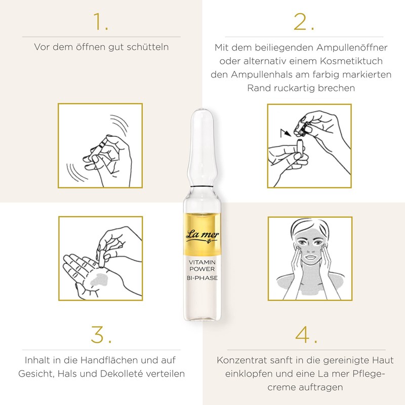 - Directions for use: Shake the ampoule briefly until the two phases are connected. Use the enclosed vial opener or alternatively a cosmetic cloth and break the ampoule neck on the coloured ring with a jerky movement. Place the contents of the ampoule into the palm of your hand and spread it to the face, neck and décolleté. Gently tap the concentrate into the cleaned skin and apply a La mer care cream.