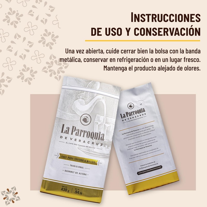 El café molido La Parroquia de Veracruz presenta un tostado fuerte y regular (full city). Su molido está diseñado especialmente para cafeteras de hogar y oficina, lo que, junto con sus otras características, garantiza una bebida de alta calidad.