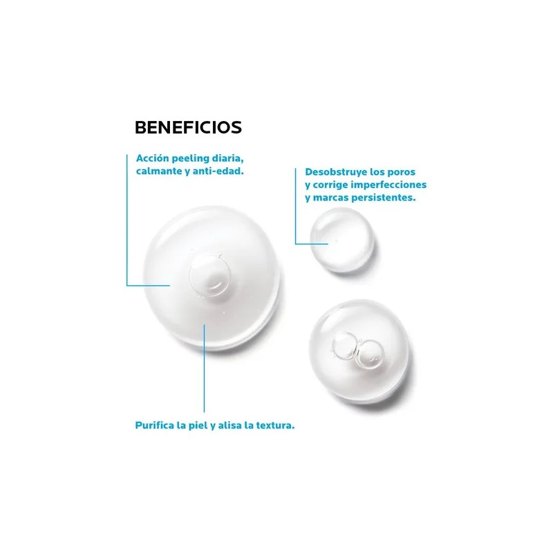 Acción exfoliante y calmante: Con 3 ácidos queratolíticos (Salicílico 1.5%, Glicólico 3.5% y LHA 0.45%) para reducir imperfecciones y marcas, y Niacinamida + Agua Termal para calmar y evitar irritación.