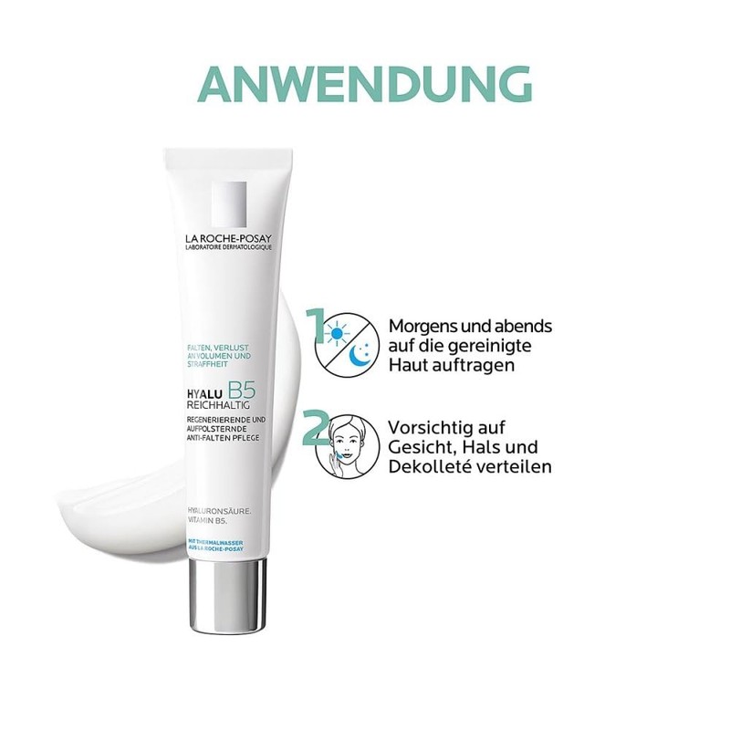 Effects of Roche-posay Hyalu B5 care cream rich (pack size: 40 ml).The thermal water from La Roche-Posay contained in Roche-Posay Hyalu B5 care cream (pack size: 40 ml) soothes even sensitive skin. The active ingredient complex of highly concentrated hyaluronic acid and vitamin B5, works in the fight against signs of ageing and additionally strengthens the skin barrier.