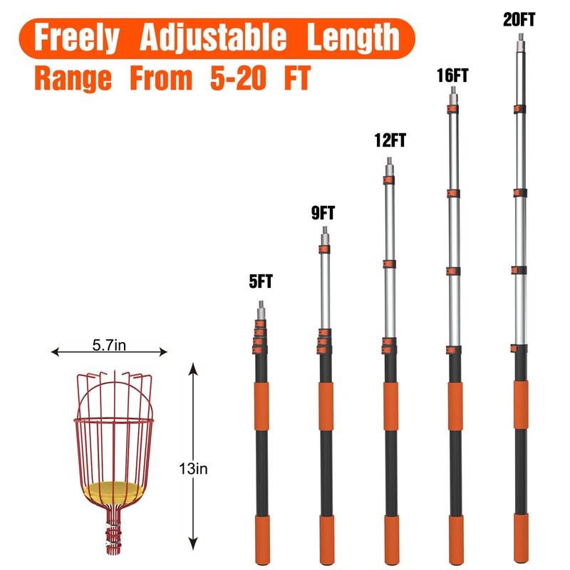 - Precision Picking Without Fruit Damage: The LAANPOLE fruit picker boasts over 26 feet of telescopic reach. This fruit picker pole with basket telescoping has an adjustable length ranging from 5 to 20 feet. It comes with a large-capacity, 5-inch diameter fruit picker basket . The carefully engineered structure allows for accurate hooking of fruits during picking, effectively preventing damage to the fruit, making it an ideal fruit tree picker tool.