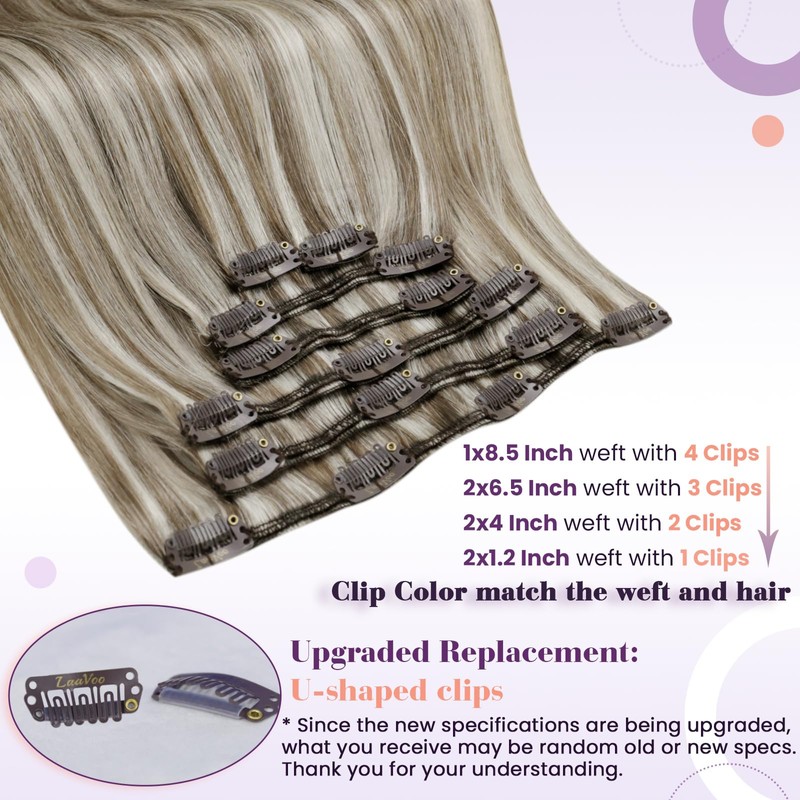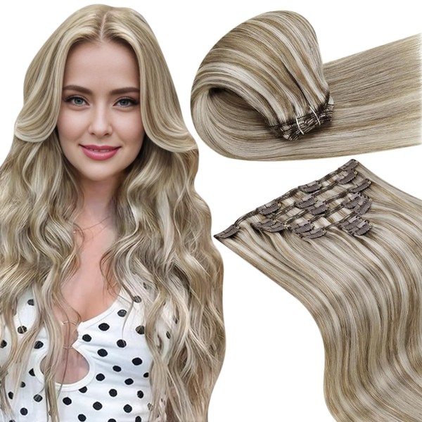 LaaVoo Clip in Hair Extensions Real Human Hair 22 Inch 7pcs 120g Light Brown and White Blonde Highlighted Hair Extensions Clip in Seamless Remy Real Hair Extensions Clip in #p8/24