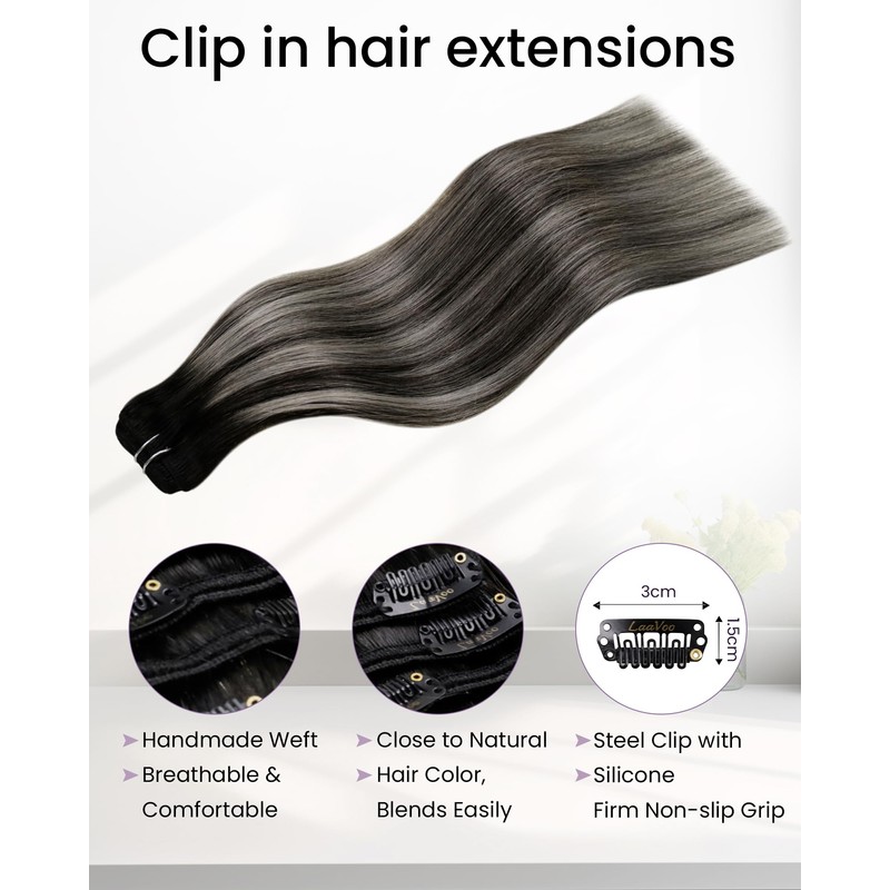 LaaVoo Hair Extensions Clip ins Black Ombre Silver Grey Balayage Clip in Hair Extensions Black Balayage Human Hair Clip in Extensions Soft Straight 20 Inch 80g/5pcs