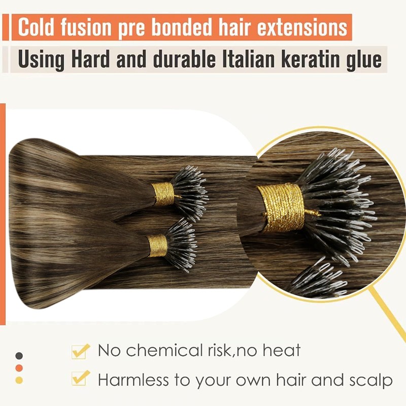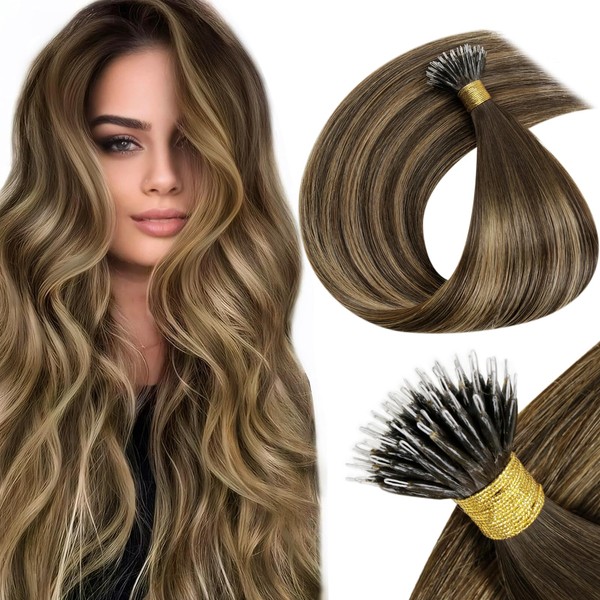 LaaVoo Nano Beads Ring Hair Extensions Balayage Dark Brown Mix Caramel Blonde Nano Hair Extensions Real Human Hair 20 Inch 50 Strands 50g Straight Remy Hair Extensions #4/27/4