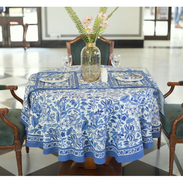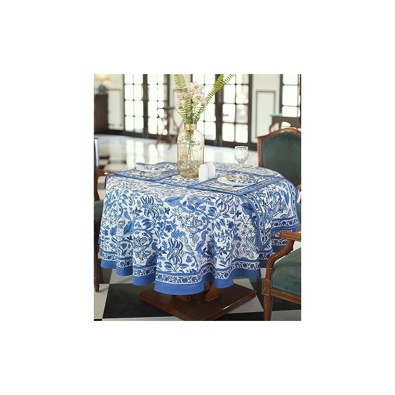 - HANDMADE INDIAN BLOCK PRINT TABLE CLOTH: Indulge in the charm of artisanal craftsmanship with our Handmade Cotton Round Table Cover, thoughtfully designed for 4-seater dining tables. Measuring approximately 60 inches Dia (150 cm x 150 cm), this exquisite tablecloth bears the mark of traditional hand block printing, each piece meticulously imprinted by skilled artisans in Jaipur,India. The delicate hemmed edges provide a subtle touch of elegance, enhancing the overall aesthetic.