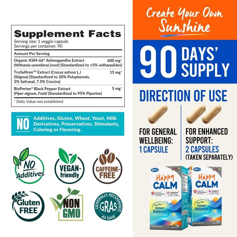 - Promotes Relaxation and Restful Sleep: The unique blend of organic Ashwagandha, TruSaffron Saffron Extract, and BioPerine Black Pepper Extract in HappyCALM is crafted to support a peaceful state of mind and encourage restful sleep. TruSaffron Saffron Extract is standardized to contain more than 7.5% crocins and over 3% safranal, ensuring a high-quality, potent ingredient for overall wellness and relaxation support.
