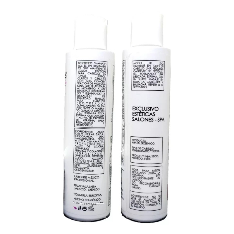 Beneficios: Shampoo S.O.S es un shampoo con alta concentración de agentes protectores, que gracias a su fórmula de poca espuma activa su proteína de soya hidrolizada, permitiendo larga duración del color, suavizando, desenredando y eliminando la sensación de resequedad ya que neutraliza el PH de tu cabello.Producto hipoalergénico.Tipo de cabello: Delgado, normal, ondulado y procesado.Tipo de clima: Seco, húmedo, frió.