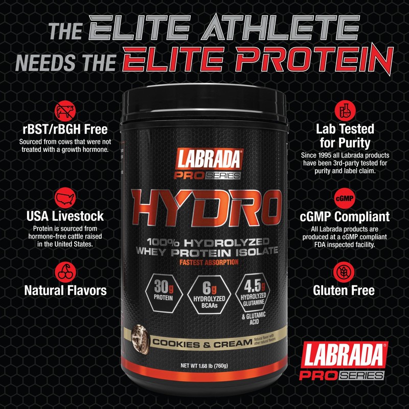 Labrada Hydro 100% Pure Hydrolyzed Whey Protein Isolate Powder, Lactose free, 6g BCAA’s, 4.5g Glutamine, Fastest Digesting Whey Available, Instant Mixing, Delicious Taste 20 Servings (Cookies & Cream)