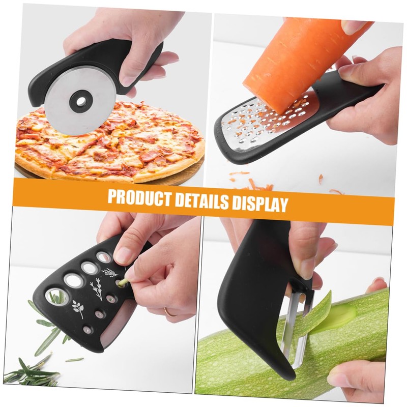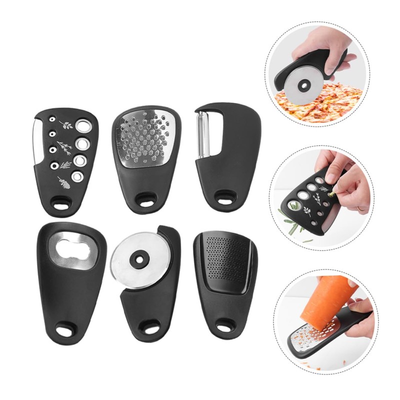 1 x Grater 1 x Peeler 1 x Garlic 1 x cutter 1 x Bottle opener 1 x Pizza cutter 1 x brush