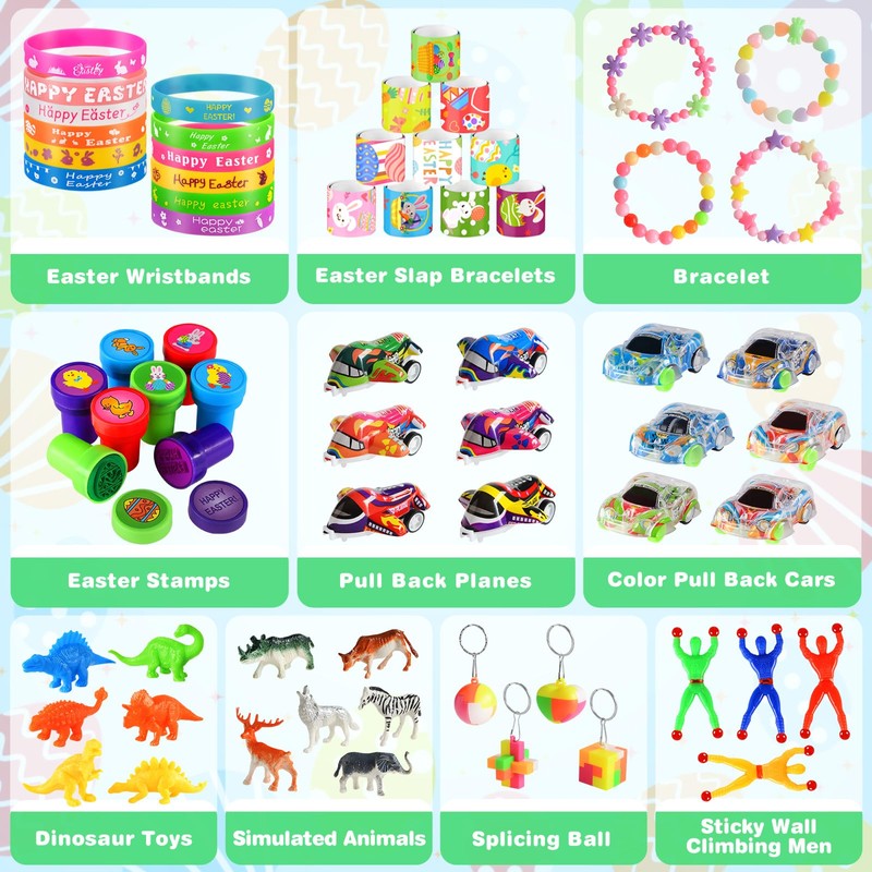 - Super Value Prefilled Easter Eggs - 100pcs prefilled Easter eggs with kid's toys inside, all toys contain various toys, such as bracelets, sticky hands, key chains, etc. These prefilled Easter eggs fit snugly on top and bottom to keep toys hidden inside until kids open the large Easter egg plastic filler. This Easter egg plastic fillable set provides a fun and exciting experience for kids as they discover new items.