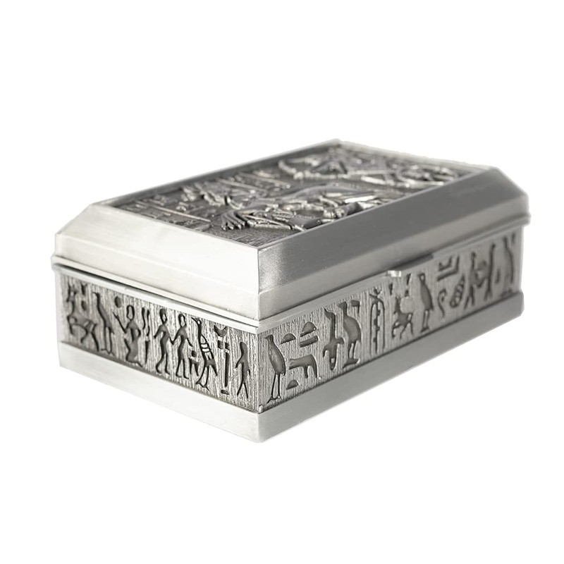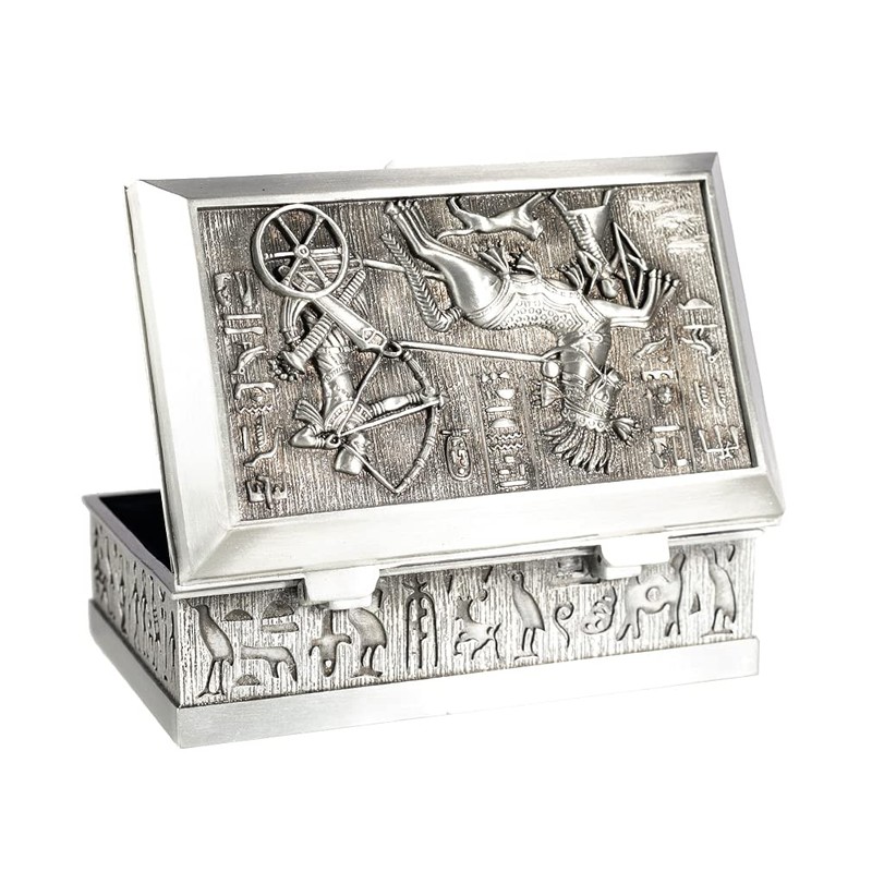 - Beautiful jewellery box, made of metal, decorated with many engravings and motifs from the Egyptian civilisation. You will notice on the top of this jewellery box, a reproduction of the battle of kadesh, or you find Ramsès II on his tank, motif from a muralous abou simbel temple. The edge of the box is also covered with engravings taking different traditional hieroglyphs of Egyptian civilization.