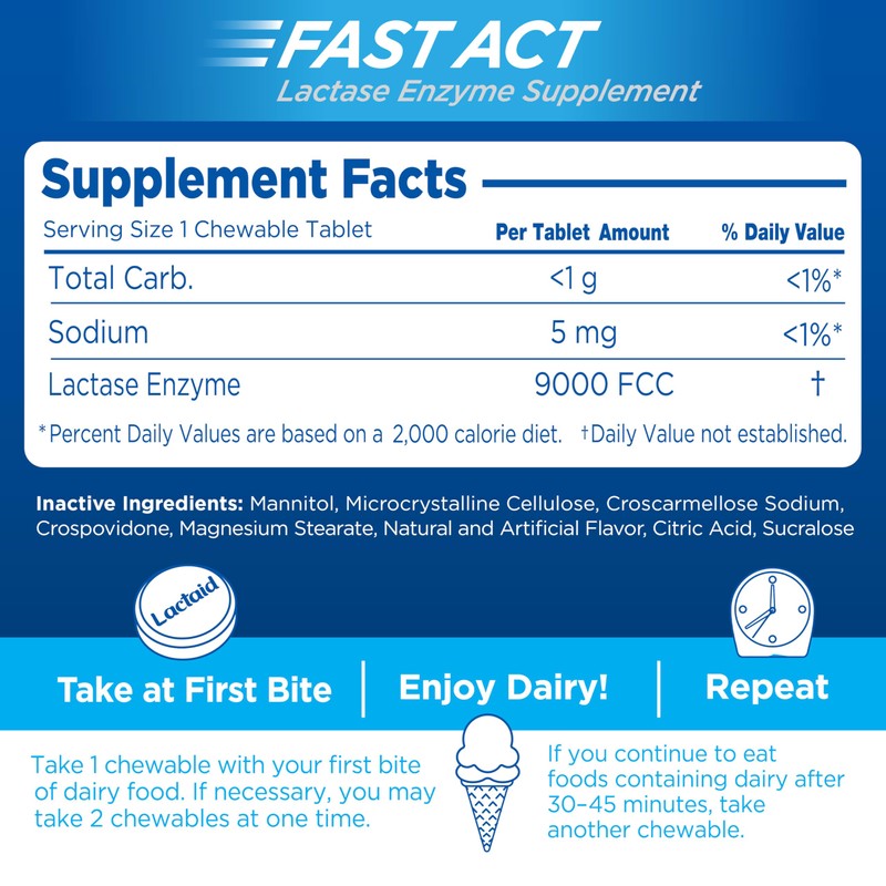 • 32-count single-dose portable packs of Lactaid Fast Act Lactose Intolerance Chewables with natural lactase enzyme come in a Vanilla Twist flavor and help prevent gas, bloating and diarrhea associated with lactose intolerance