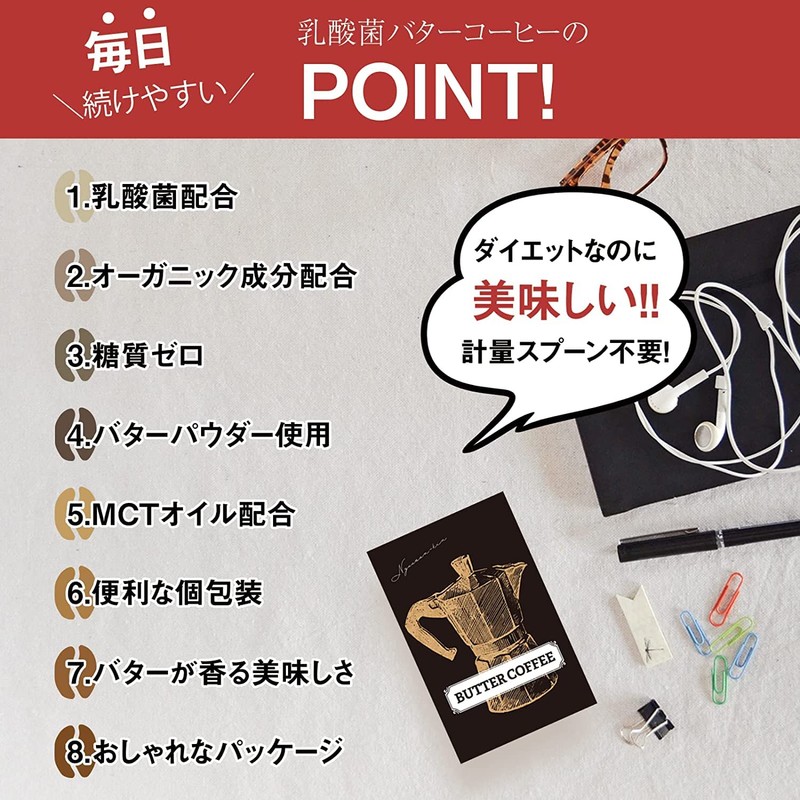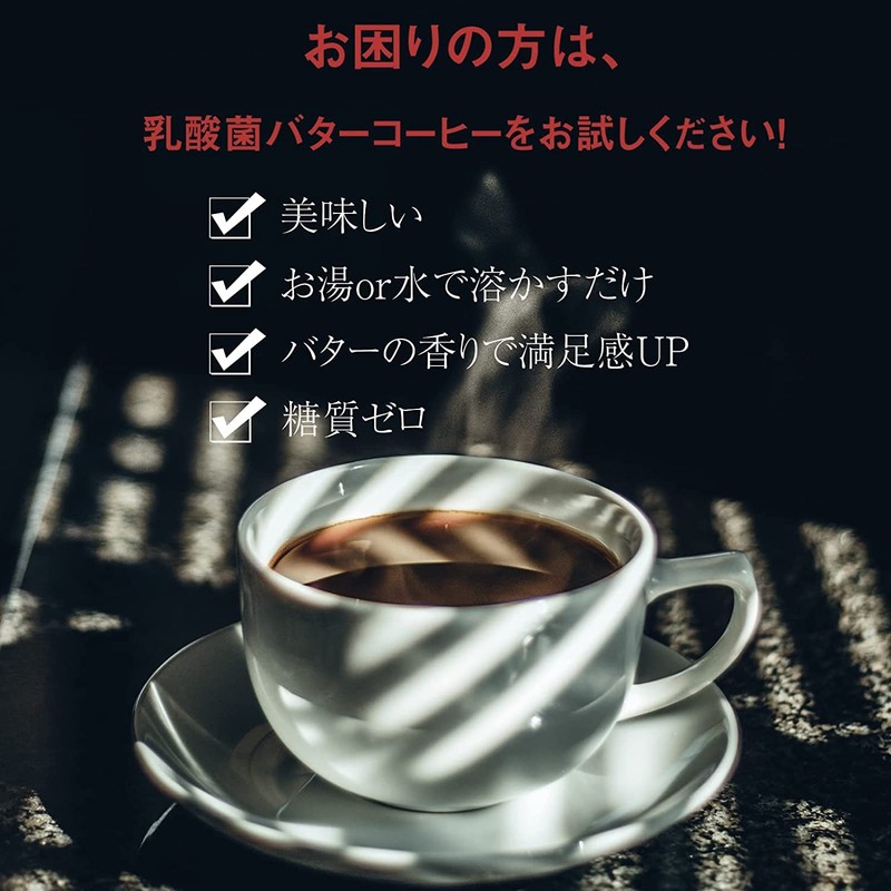Lactic acid Butter Coffee, which contains approximately 1 trillion (30 packs) and is made with zero sugar content and an MCT oil to support everyday cleanliness. Adopts butter powder that is suppressed. If you are interested in beauty, health, and dieting, we would like to give it a try. It is also recommended as a replacement diet for your morning with a rich butter scent that is satisfied.