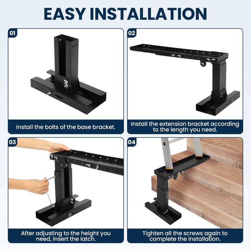 • Adjustable Ladder Base for Stairs: By changing the position of the pins, the ladder extender can be adjusted from 10.4 to 17.5 inches in height and 20 to 29 inches in length to meet different needs and accommodate a variety of steps.