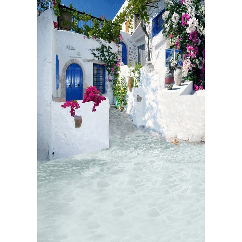 Laeacco 5x7ft Greece Backdrop Romantic Santorini Wedding Photo Backdrop Aegean Sea Greek Architecture White Stone House Flowers Momma Mia Theme Birthday Party Background Family Party Photo Studio Prop