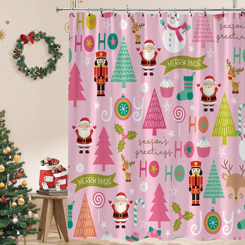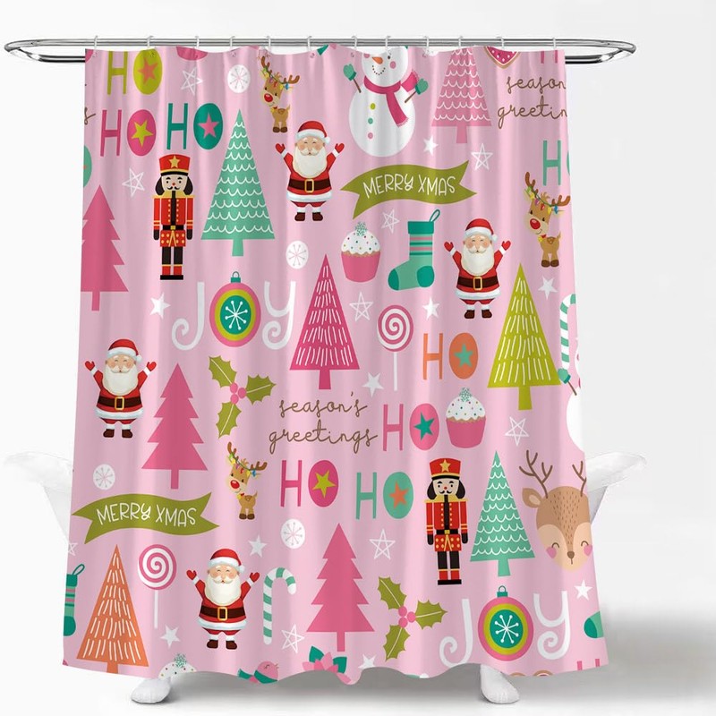 LAEDCIITI Cartoon Pink Christmas Shower Curtain Santa Claus Snowman Penguin Tree Present Happy New Year Merry Christmas Modern Winter Xmas Holiday Festival Fabric Bath Curtain Set with Hook