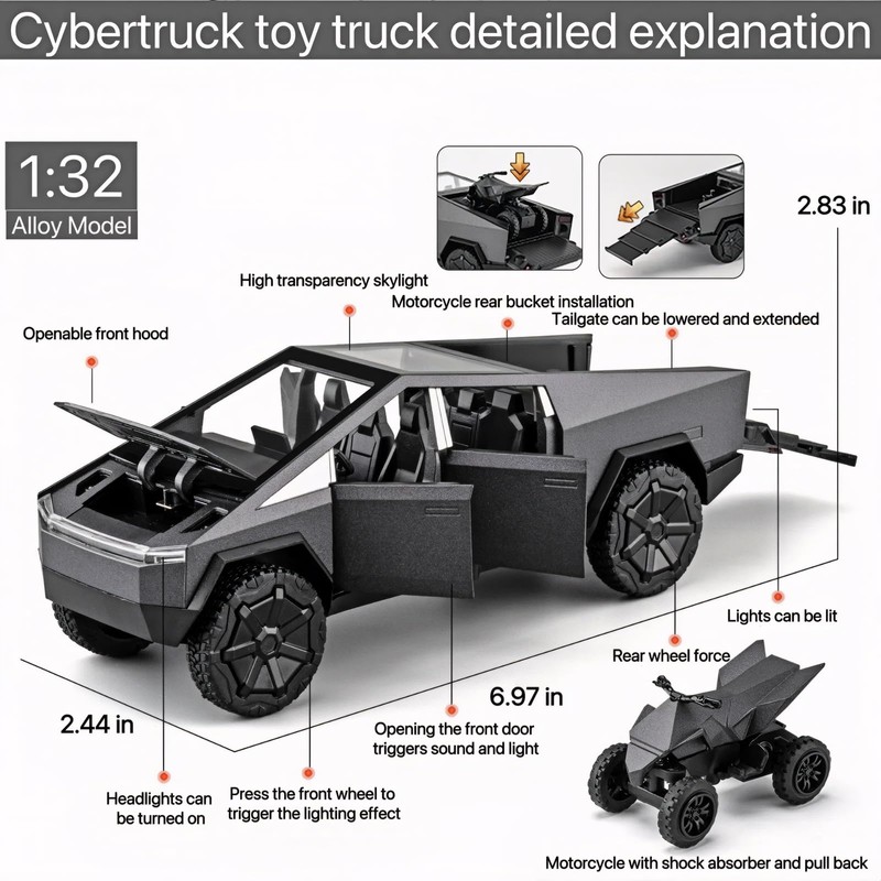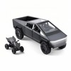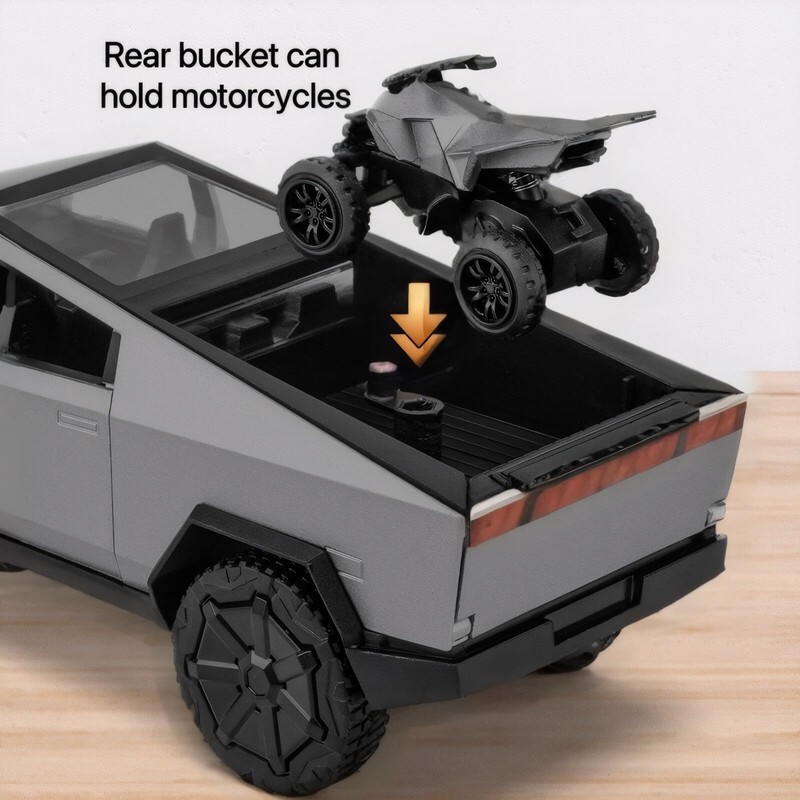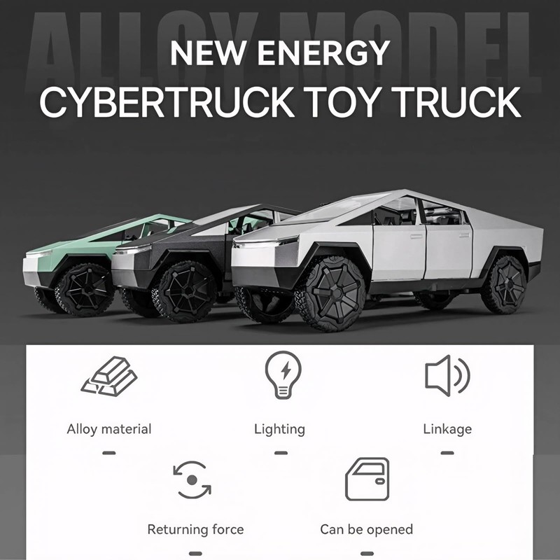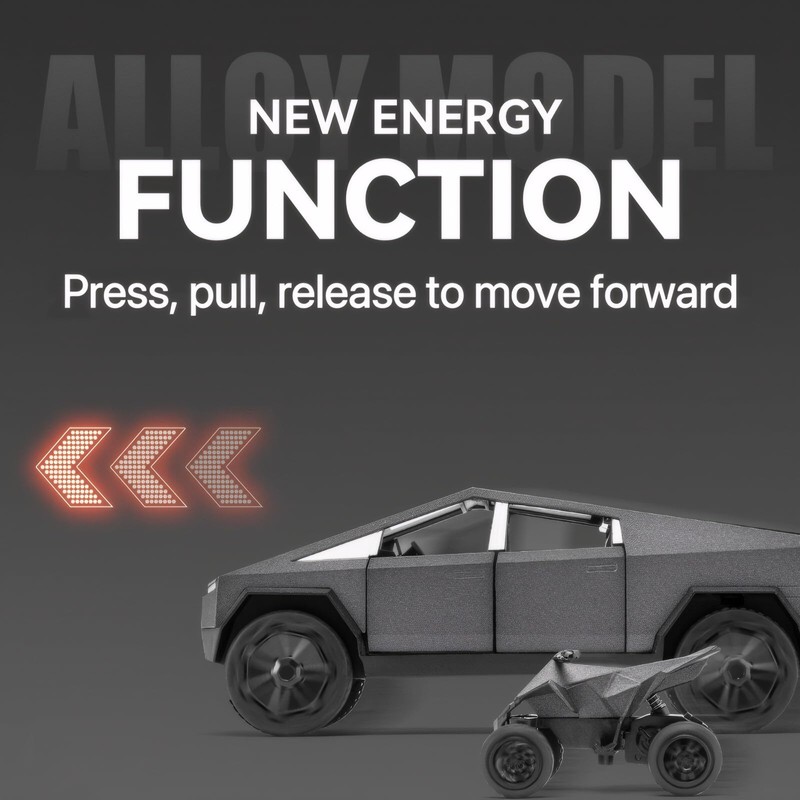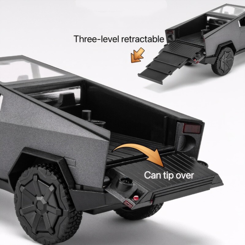 - 🚀1. Classic Restoration: Inspired by Cybertruck, this model replicates its iconic angular design with futuristic, industrial look. Made with an alloy body, plastic parts, and rubber tires, it faithfully captures the vehicle's details and structure.