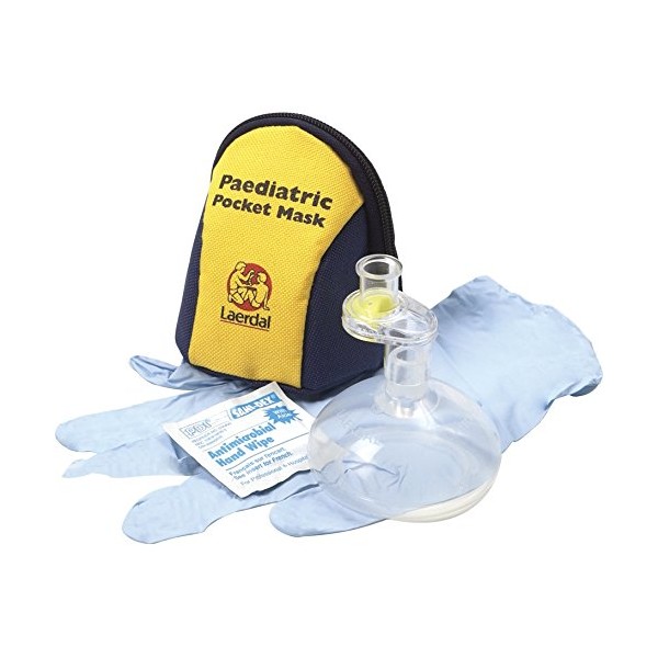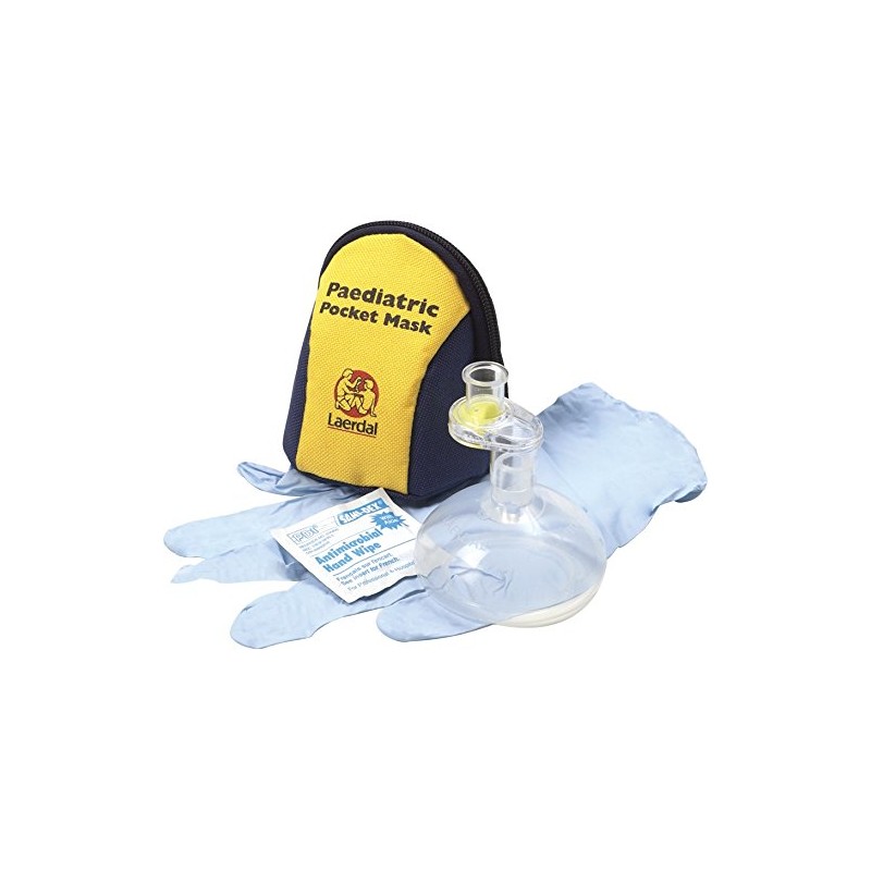 The Laerdal Paediatric Pocket Mask is a device designed for mouth-to-mask ventilation of a non-breathing child or infant. The device should only be used by persons who have received adequate training. The Laerdal Paediatric Pocket Mask comes with gloves ad wipe for additional protection and is supplied in a soft carry case with belt strap and clip. The mask is latex free and a single patient use device.