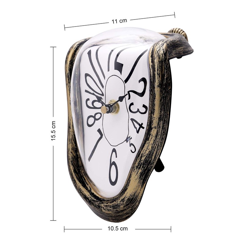 - Creative Surrealism Clock: Surrealist melting clock is inspired by Dali's surrealist painting "the persistence of memory". The distressed bronze frame, novelty Arabic numbers and unique clock shape will easily attract people's attention.