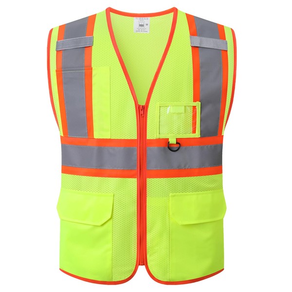 - DUAL-TONE REFLECTIVE STRIPS - The hi-vis construction vest with pockets and zipper features dual-tone reflective strips that are highly reflective, making them easy to spot from a distance. The High vis vest for men reflective strips are designed to catch the light from any angle, keep the wearer remains visible, even in adverse weather conditions such as rain, fog, or snow.Please order the next 1 or 2 sizes up for loose-fitting purposes.