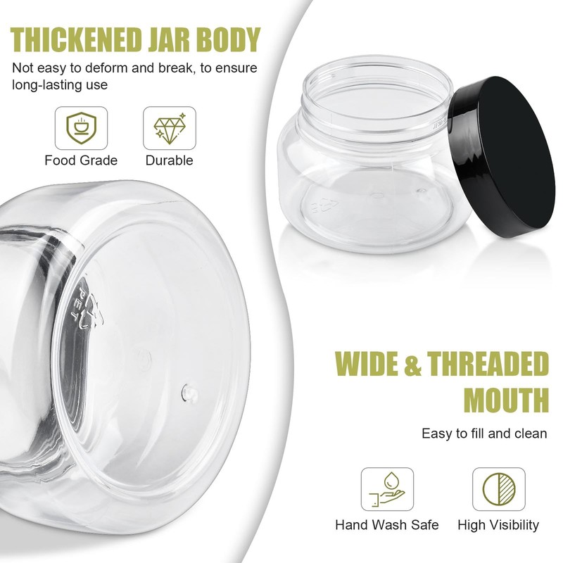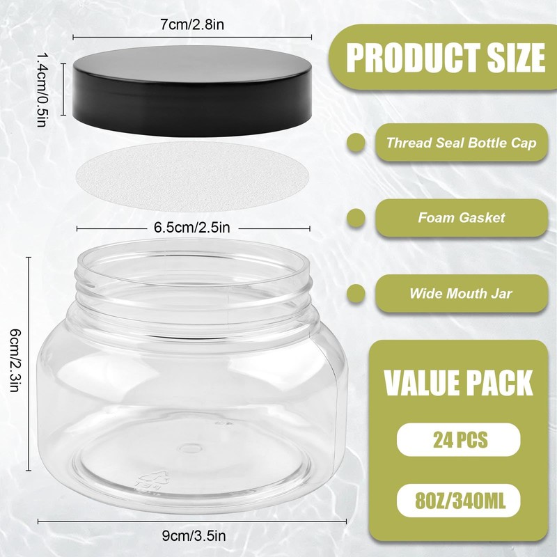 This 24 Piece 8oz plastic jars with lids is the perfect solution for your storage and organization! Compact size (3.5x2.5 inches) is easy to carry, wide mouth design is easy to fill and clean, stacking storage saves space. Ideal for home, beauty studio or commercial use such as sample distribution, promotional events, etc. From bathroom to kitchen, from studio to travel bag, this empty refillable container set is your right-hand man