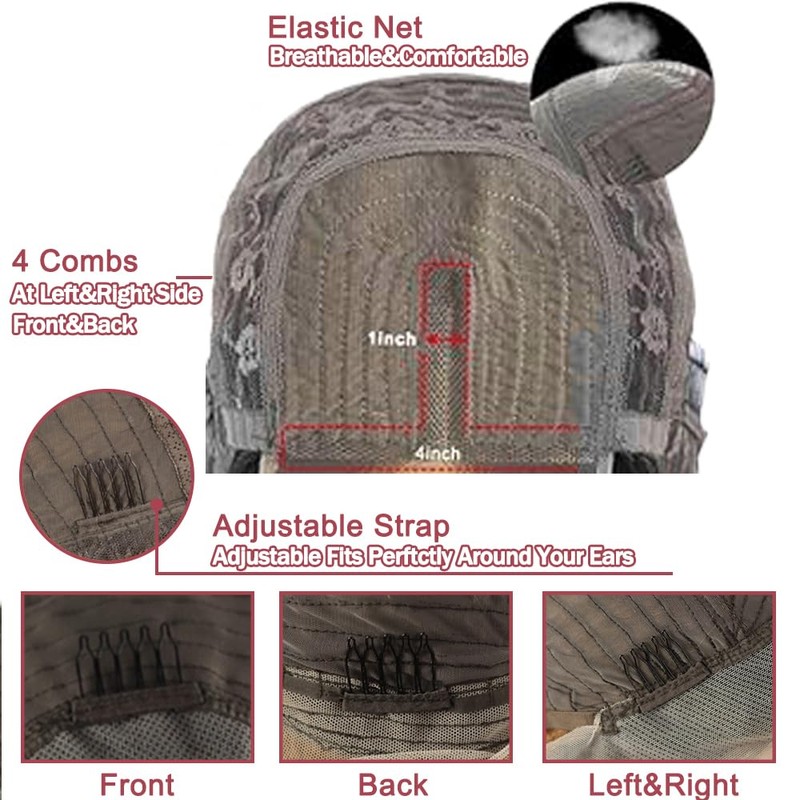 4. Hair cap: elastic and breathable net, medium size (21.5-22.5 inches) with adjustable straps, 4 combs.