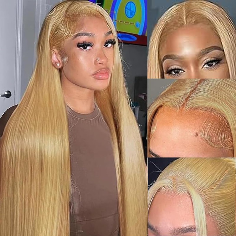 Lakaisa Human Hair Straight Human Hair Wig 4 x 1 Lace #27 Blonde Glueless Wear and Go Wig Women's Real Hair Pre Bleached Knots Pre Plucked with Baby Hair for Woman 28 Inches
