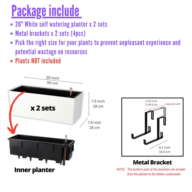 - 2 PACK SET: 20 Inch, white fence hanging planters with drainage holes, check image for detailed dimension. Pick the right size for your plants to prevent unpleasant experience and potential wastage on resources