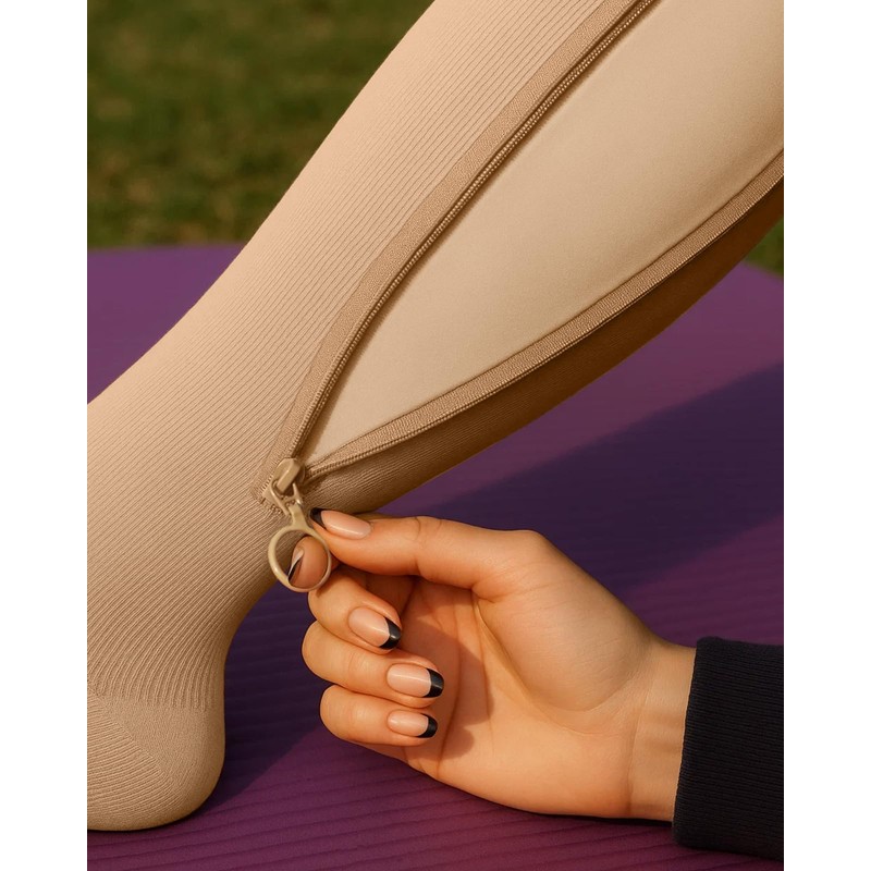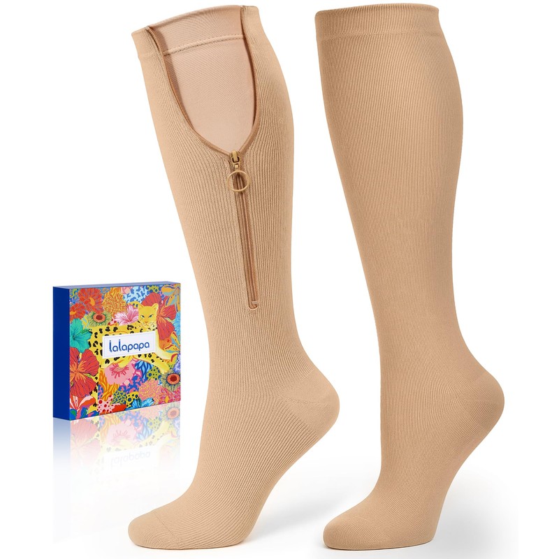 Lalapapa Zipper Compression Socks for Women - Compression Socks with Inner Lining Adjustable 20-30mmHg Graduated Support, Nude, L/XL