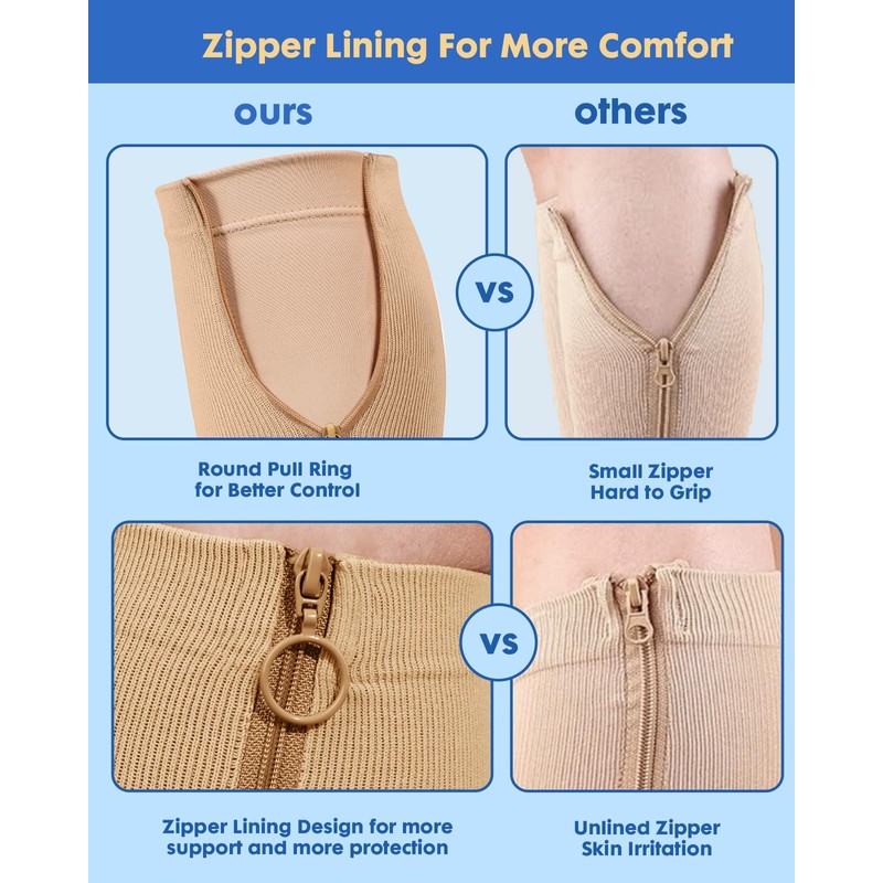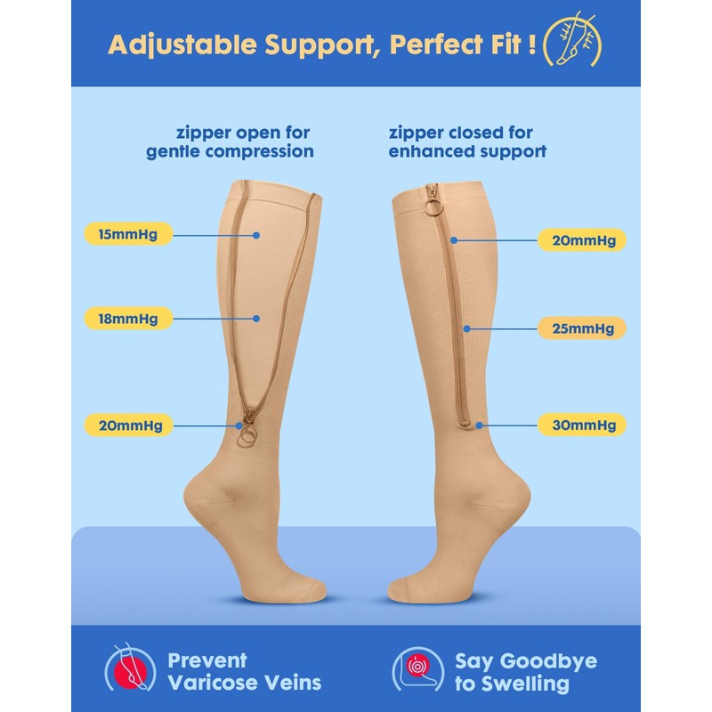 - Adjustable Compression Levels: Experience two compression levels in one product: low pressure (15-20mmHg) when the zipper is open and high pressure (20-30mmHg) when zipped up. The innovative inner lining ensures comfort during wear, preventing irritation while providing a seamless transition between compression levels. Designed to provide comfortable compression that supports leg health and promotes a more active lifestyle