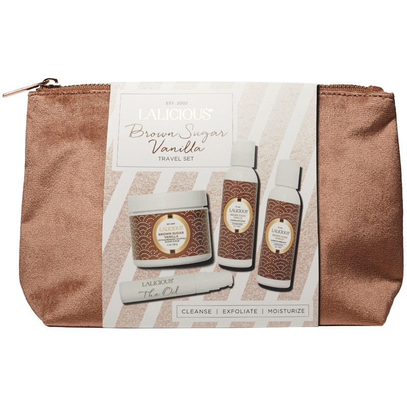 LaLicious Brown Sugar Vanilla Skin Care Travel Set - Whipped Sugar Scrub, Shower Gel / Bubble Bath, Body Butter & Body Oil in a Luxe Velour Makeup Bag (4 Piece Kit)