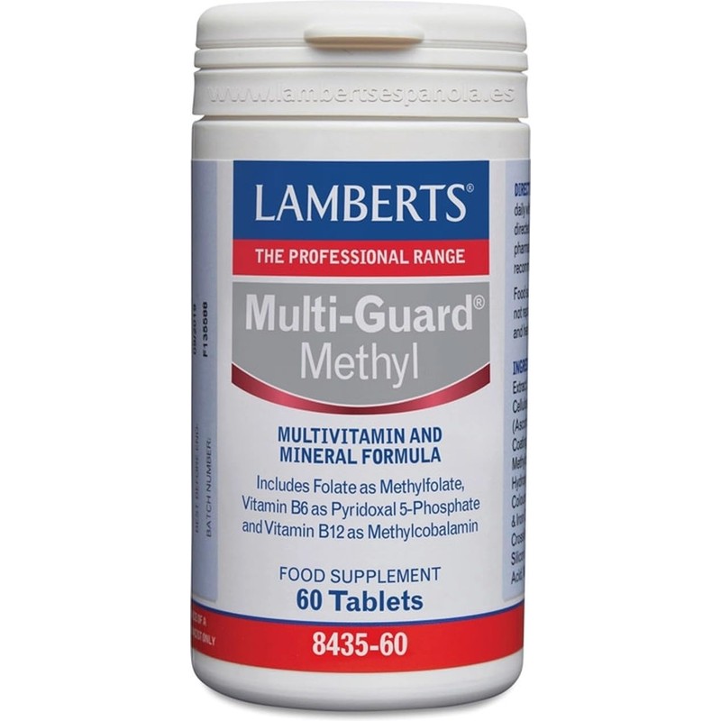 Product DescriptionLamberts Multi-Guard Methyl 60 TabletsIngredientsAg. Loading (Cellulose), Magnesum (Citrate and Oxide), Vit C (Ascorbic Acid), Iron Citrate, Niacin (Nicotinamide), Vit. K2 (Menaquinone-7), Acc. Pantothenic (Calcium Pantothenate), Agts. Coating (Hydroxypropyl Methylcellulose, Polydextrose, Dyes: Calcium Carbonate and Iron Oxide), Zinc Citrate, Vit. E (d-alpha tocopherol), Anti-caking agent (Silicon Dioxide, Stearic Acid and Magnesium Stearate), Choline Bitartrate, Inositol, Vit. A Acetate, Vit. B6 (Pyridoxal 5-Phosphate), Vit. D3, Chrome Chloride, Thiamine Mononitrate, Riboflavin, Copper Sulphate, Manganese Sulphate, Folate (Quatrefolic Acc. (6S)-5-methyltetrahydrofolico), Vit. B12 (Methylcobalamin), Selenium (Sodium Selenite), Potassium Iodide, Sodium Molybdate, Biotin