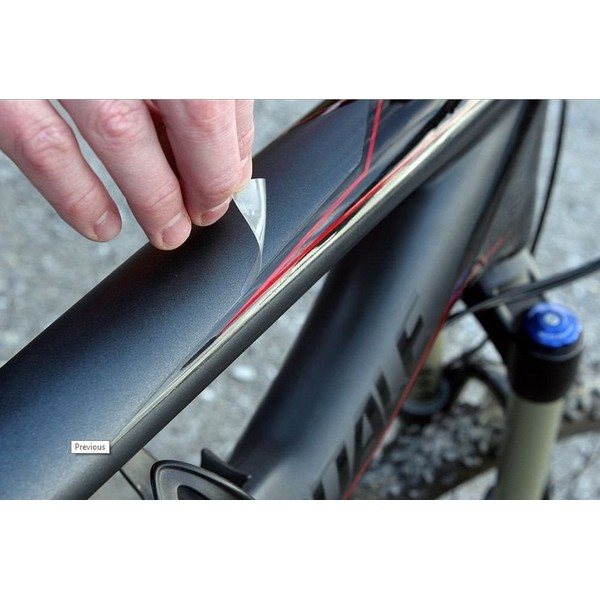 This bike frame tape is a universal strip specifically designed to help protect your bike frame's precious finish with an invisible layer of durable glossy "helicopter tape" material that is 8 mils thick. This kit includes: a 4" x 60" of glossy protection film, spray bottle, application card, snap blade, and instructions. Just measure, apply, and trim to fit as necessary.